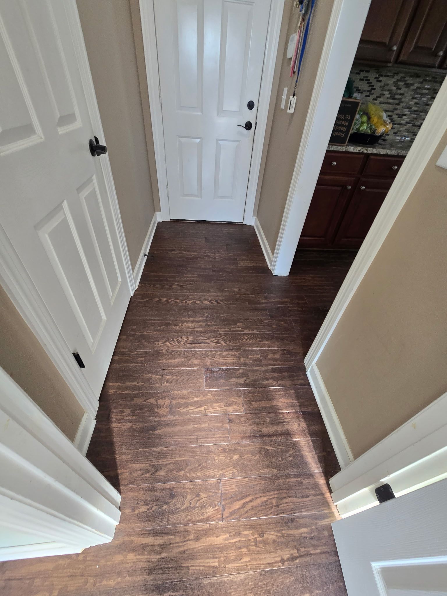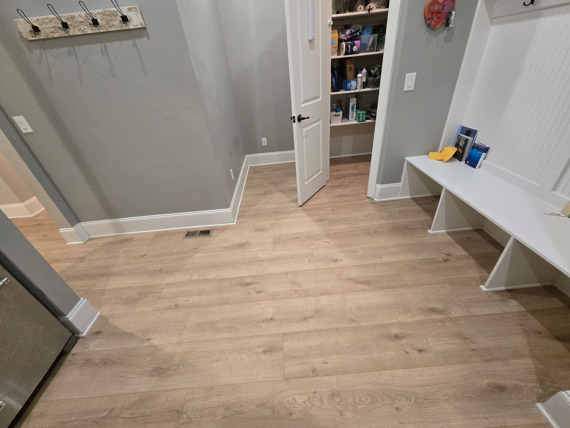 The Sorenson Project highlights a full-home transformation with rich, wood-look laminate flooring installed throughout a variety of spaces. The natural grain patterns and warm tones bring a welcoming feel to each room, offering the look of real hardwood with the durability and easy maintenance of laminate. From the front entryway to the living areas and even into closets and hallways, this project showcases Baldwin Family Flooring’s attention to detail and commitment to delivering high-quality, functional flooring solutions that enhance both style and comfort in the home.