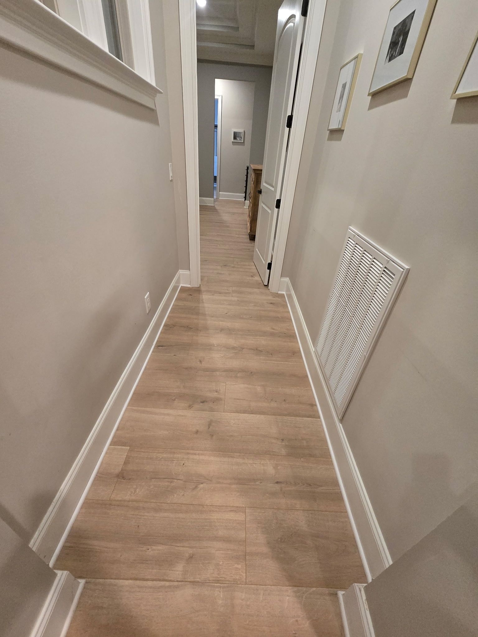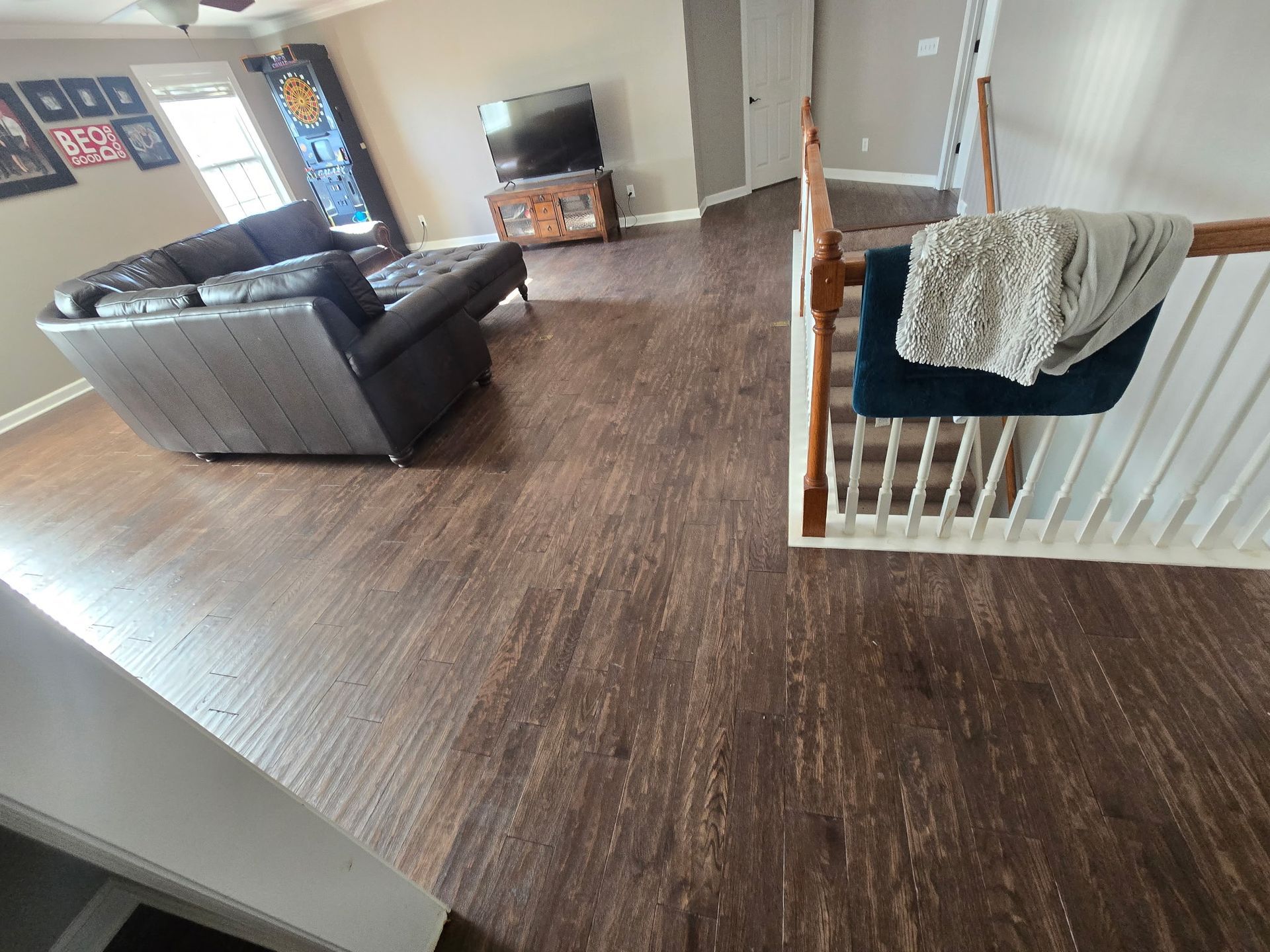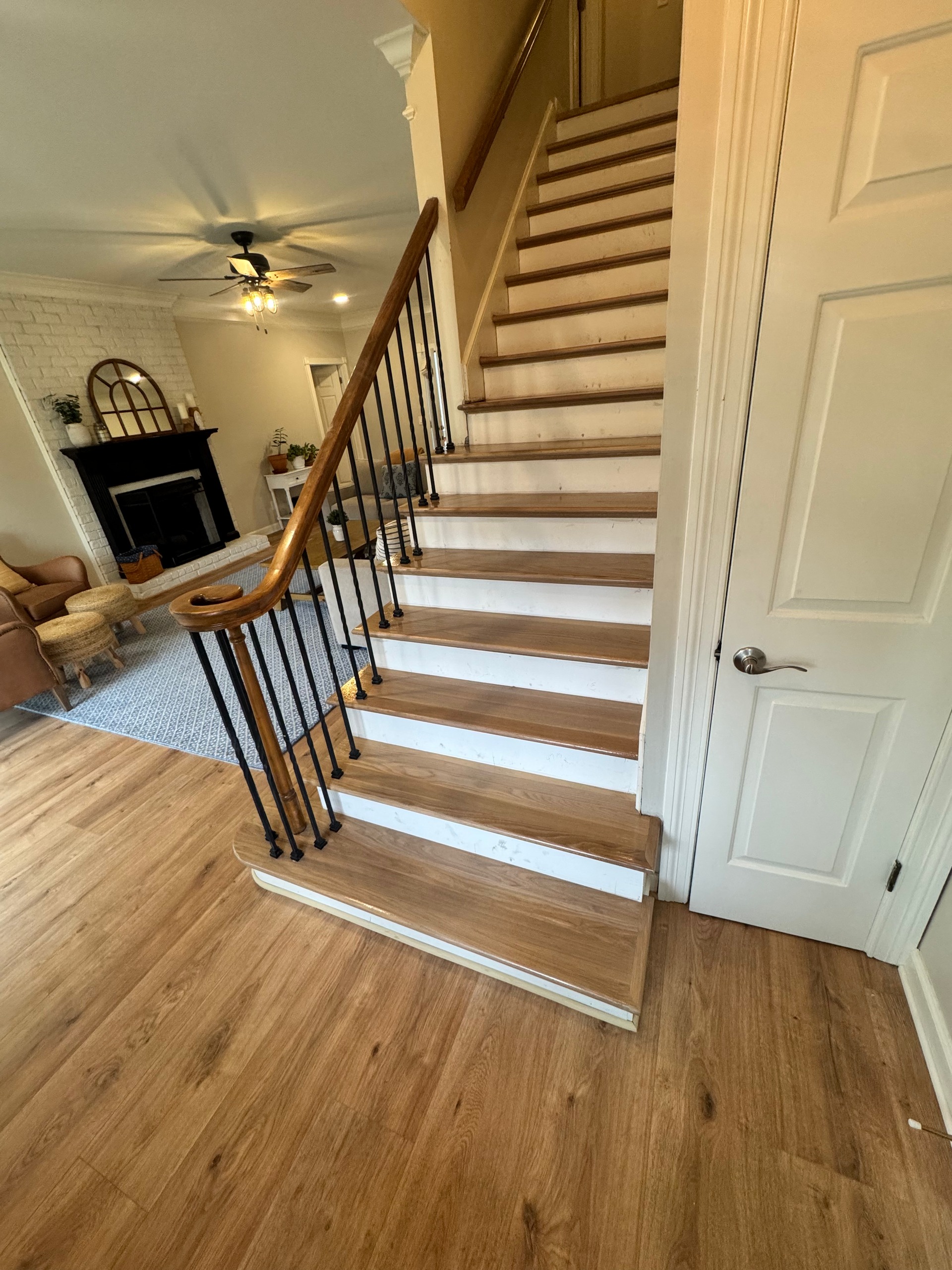 The Utley Project features a full-home transformation with beautifully installed laminate flooring and expertly refinished hardwood stairs. The warm, natural tones of the laminate bring a cohesive, modern look to the living spaces, while the refinished steps provide a smooth, elegant contrast and seamless transition between levels. This project highlights Baldwin Family Flooring’s attention to detail and commitment to combining style with long-lasting function.