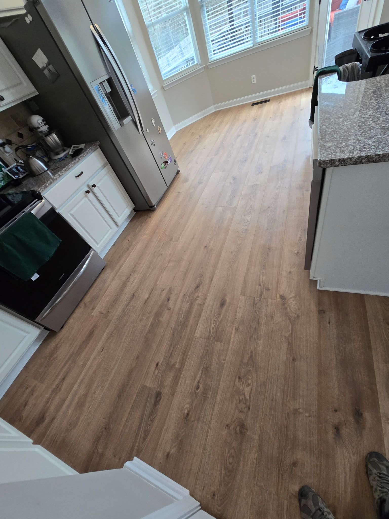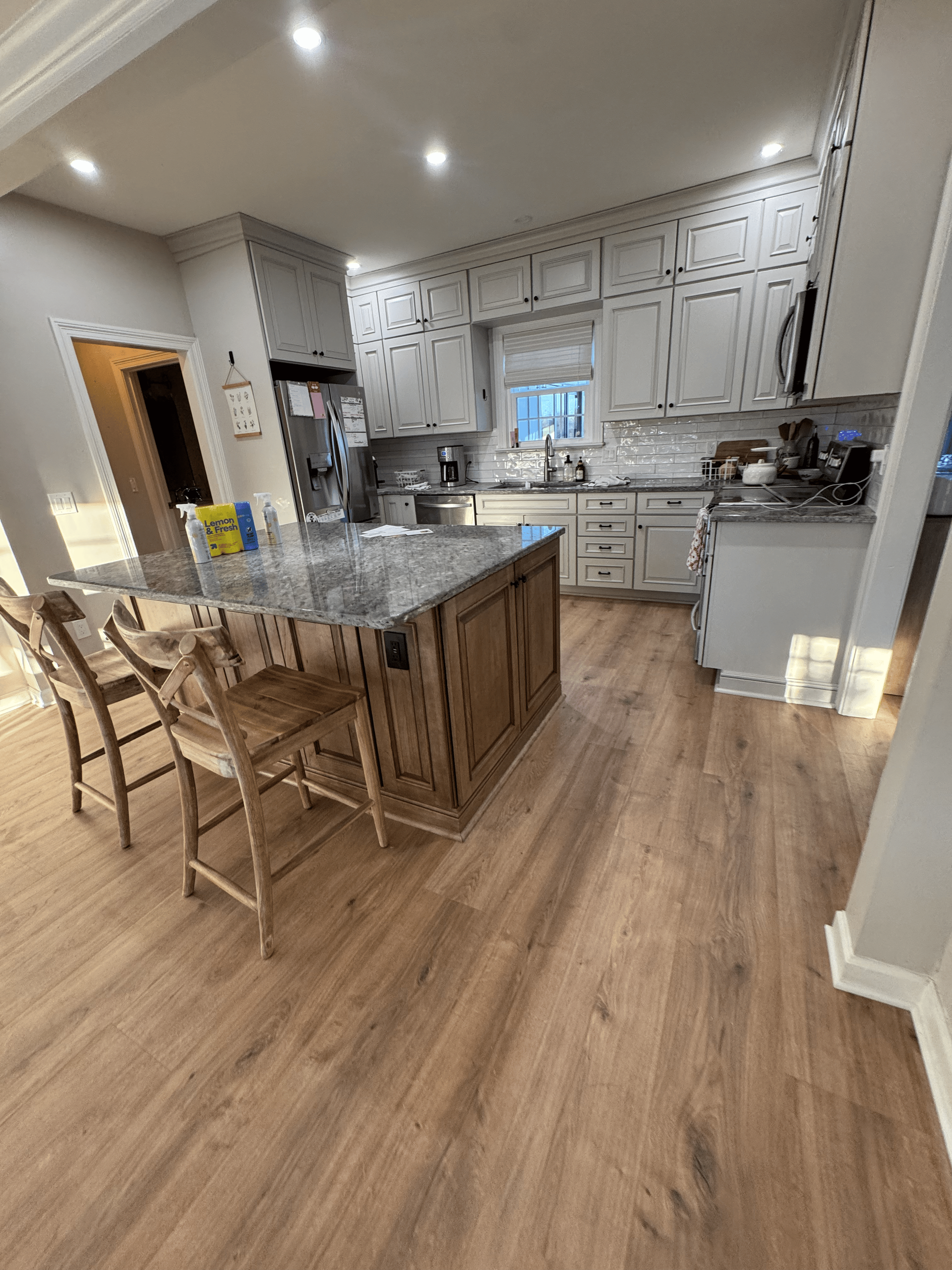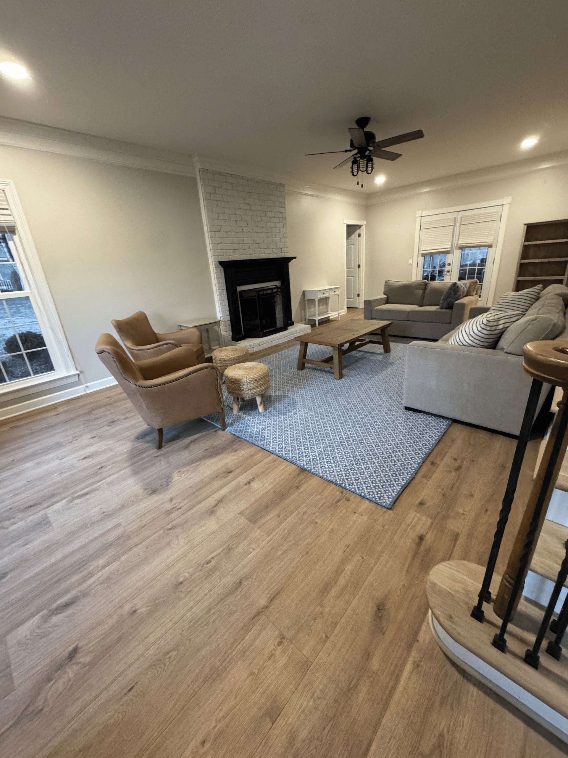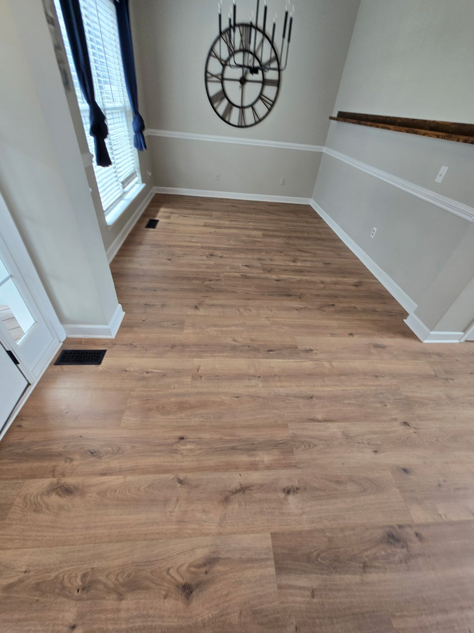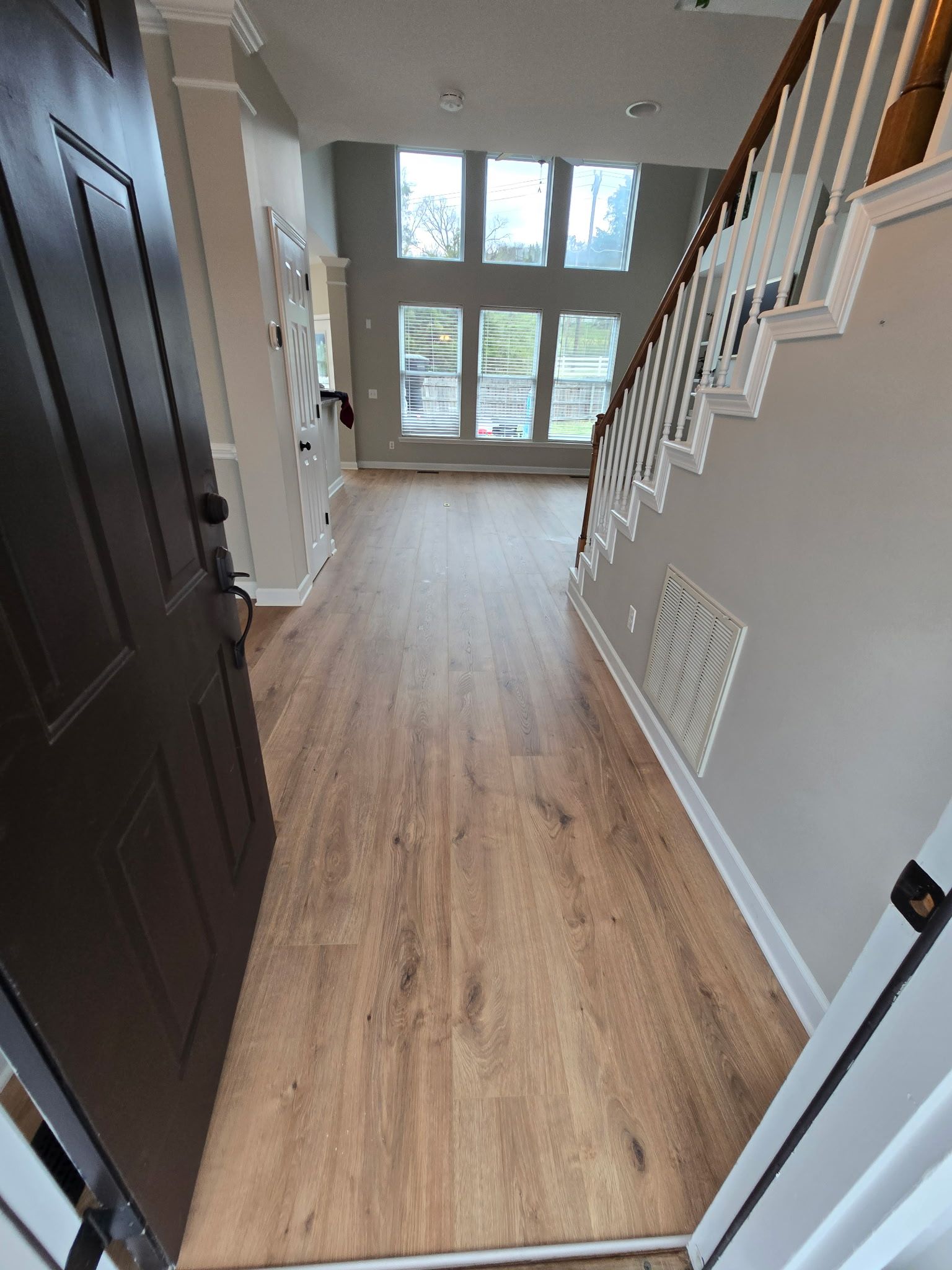 For this project, we installed luxury vinyl plank flooring throughout the open living space and adjoining areas, creating a modern, cohesive look with excellent durability. The natural wood inspired finish delivers warmth and texture while maintaining a clean, contemporary feel. Precise layout and tight seams ensure smooth transitions through doorways, stairs, and open rooms, allowing the flooring to flow seamlessly from space to space. Designed to withstand heavy foot traffic, moisture, and daily use, this LVP installation offers long lasting performance with the appearance of real wood, making it an ideal solution for both style and function.