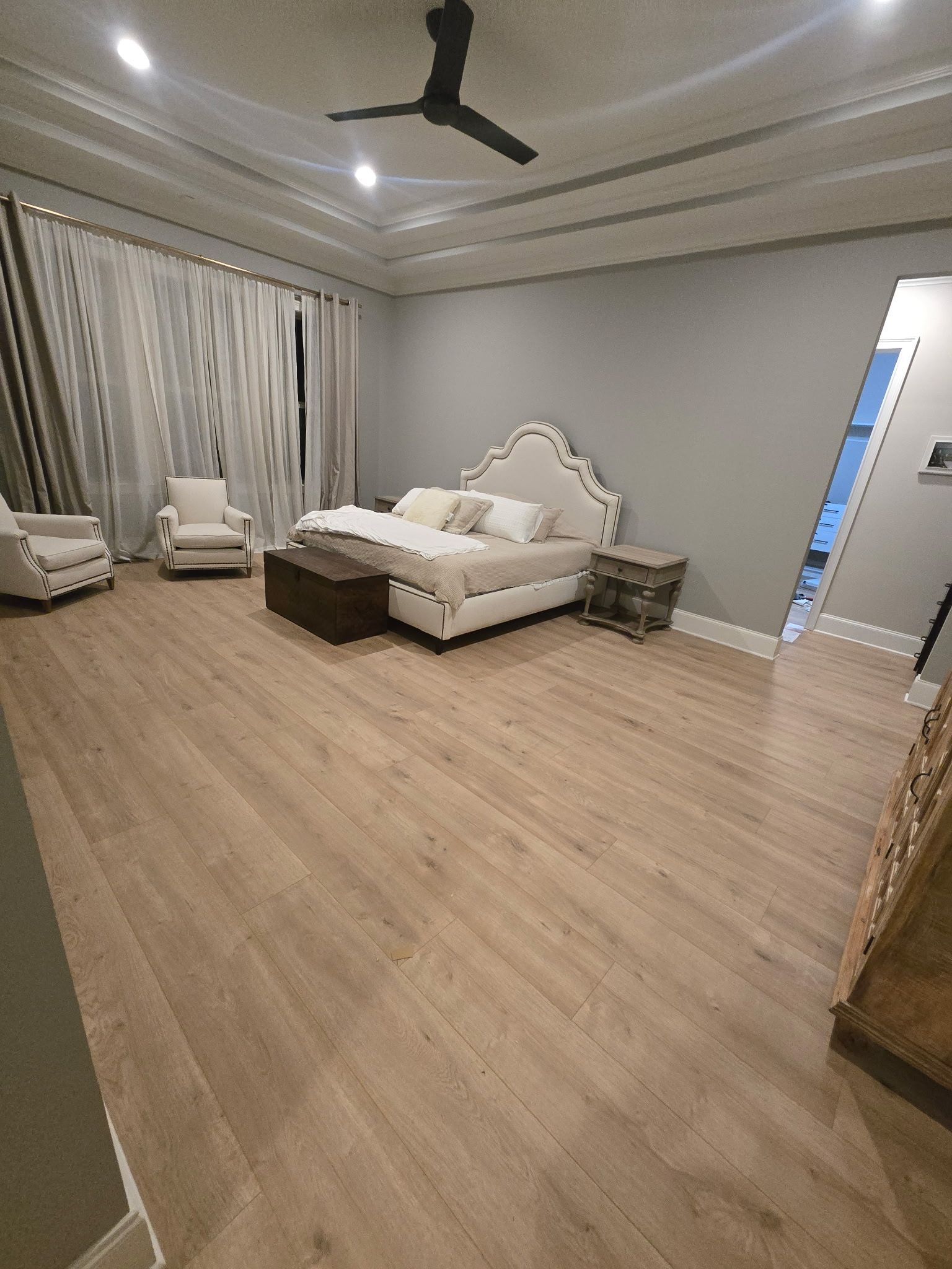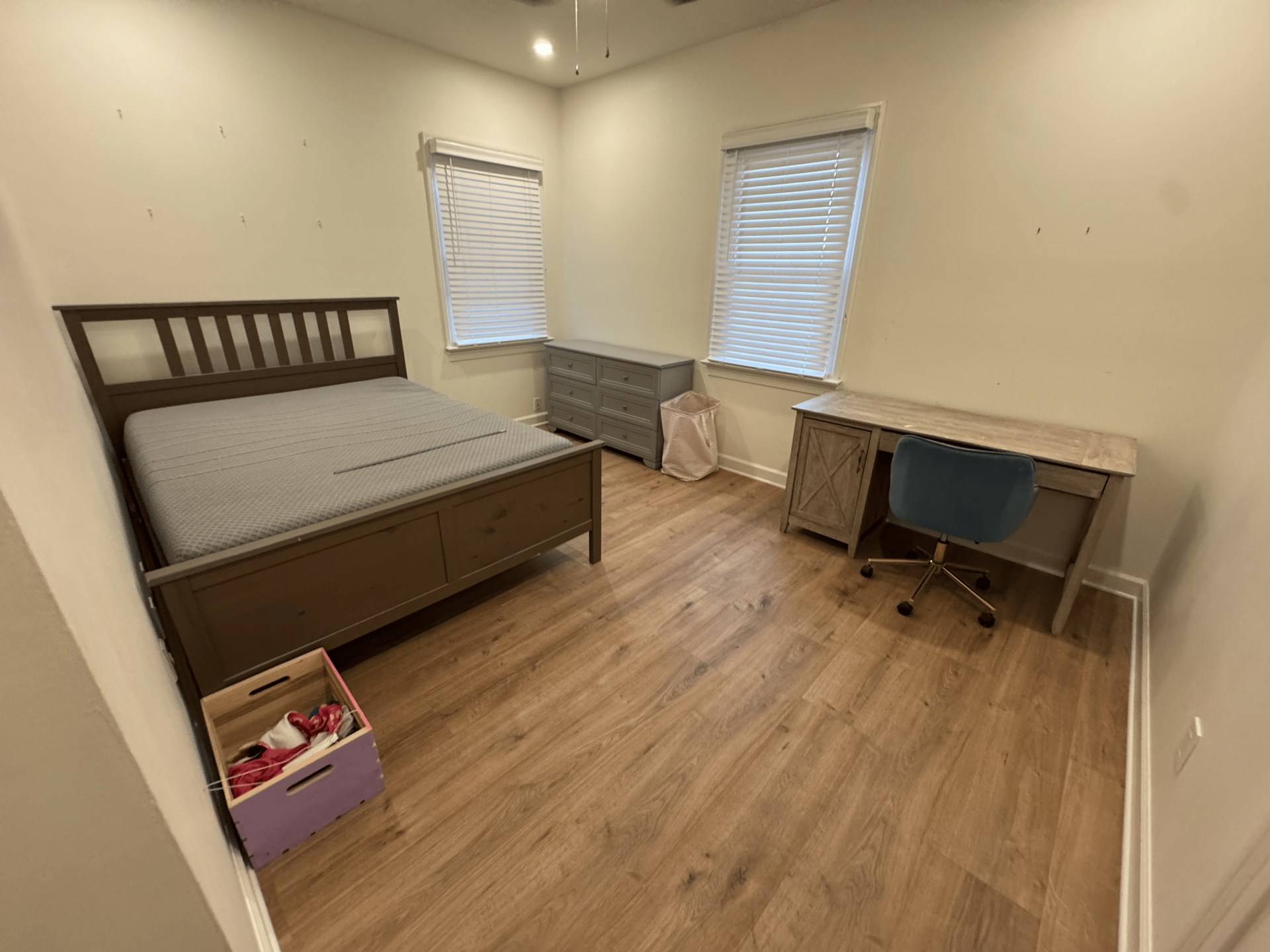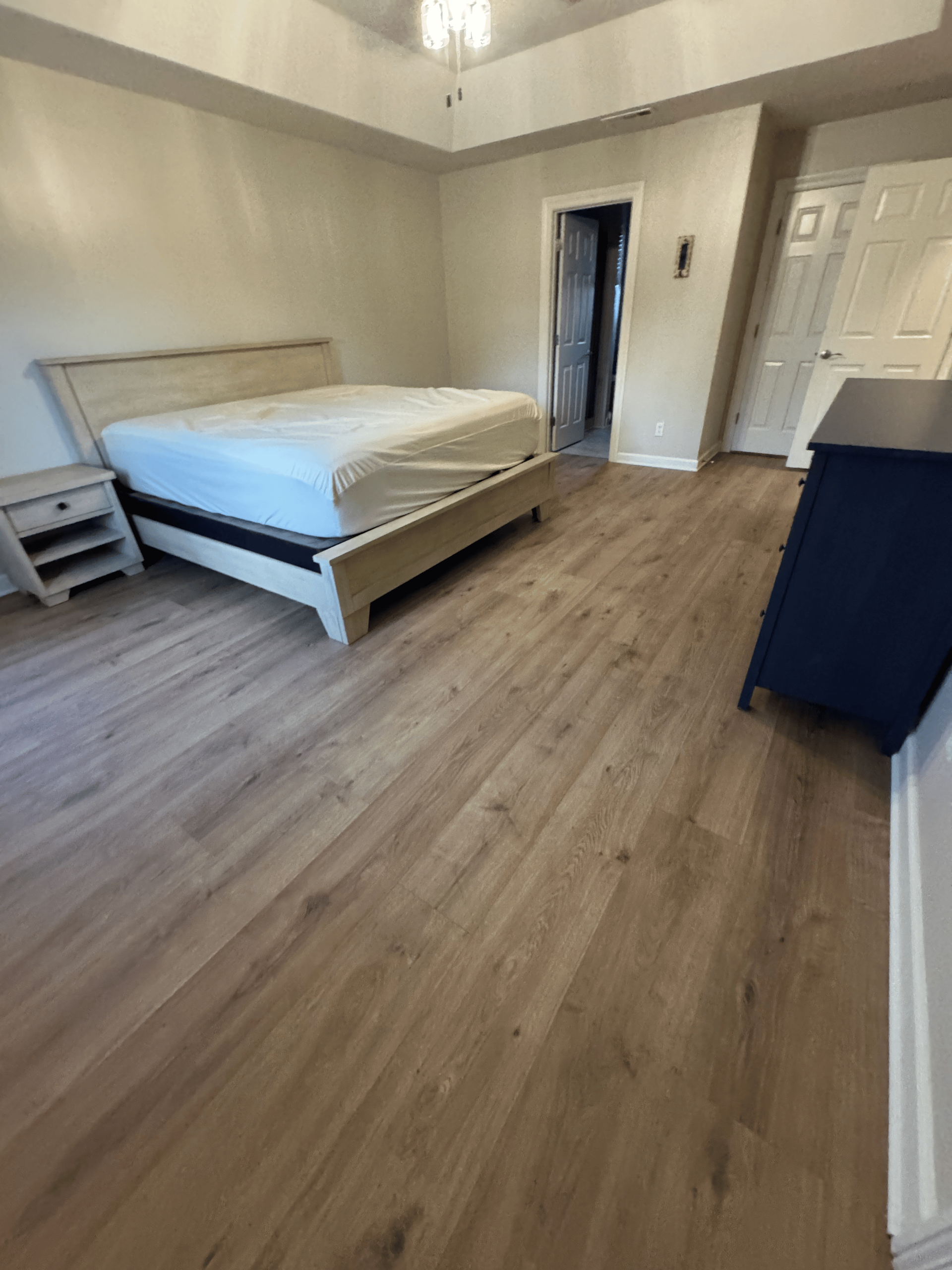 We installed a modern gray oak laminate flooring throughout the bedrooms and closets to create a clean and cohesive look across the home. The wide planks feature a subtle wood grain pattern that adds natural character while maintaining a sleek, contemporary feel. With its durable, waterproof, and scratch-resistant design, this flooring is perfect for everyday living and will hold up beautifully in both high-traffic areas and private spaces. The consistent flow from room to room enhances the sense of openness, while the soft gray tones complement the light walls and trim, creating a bright and inviting atmosphere that is both stylish and practical.