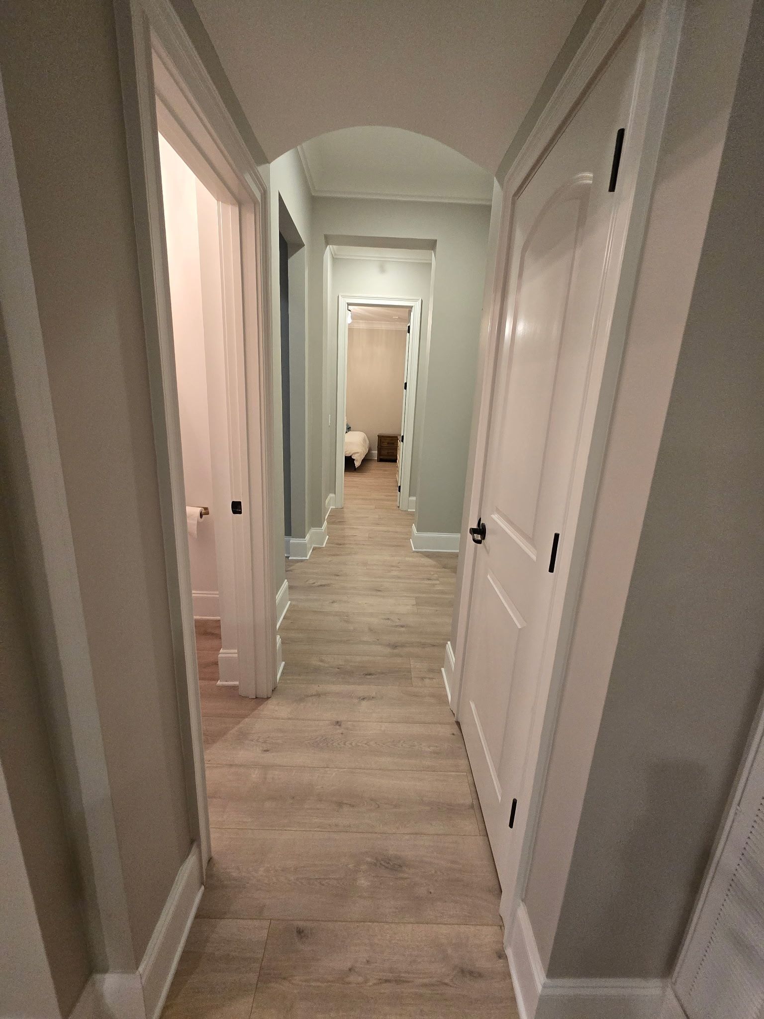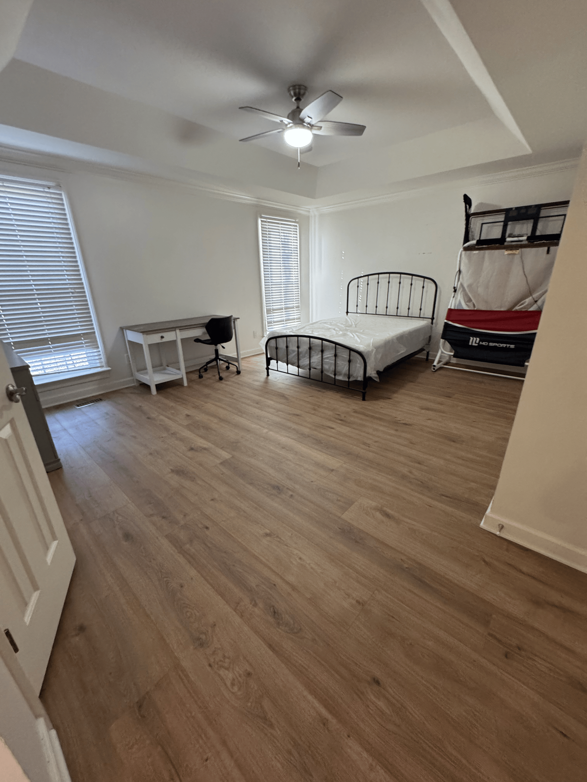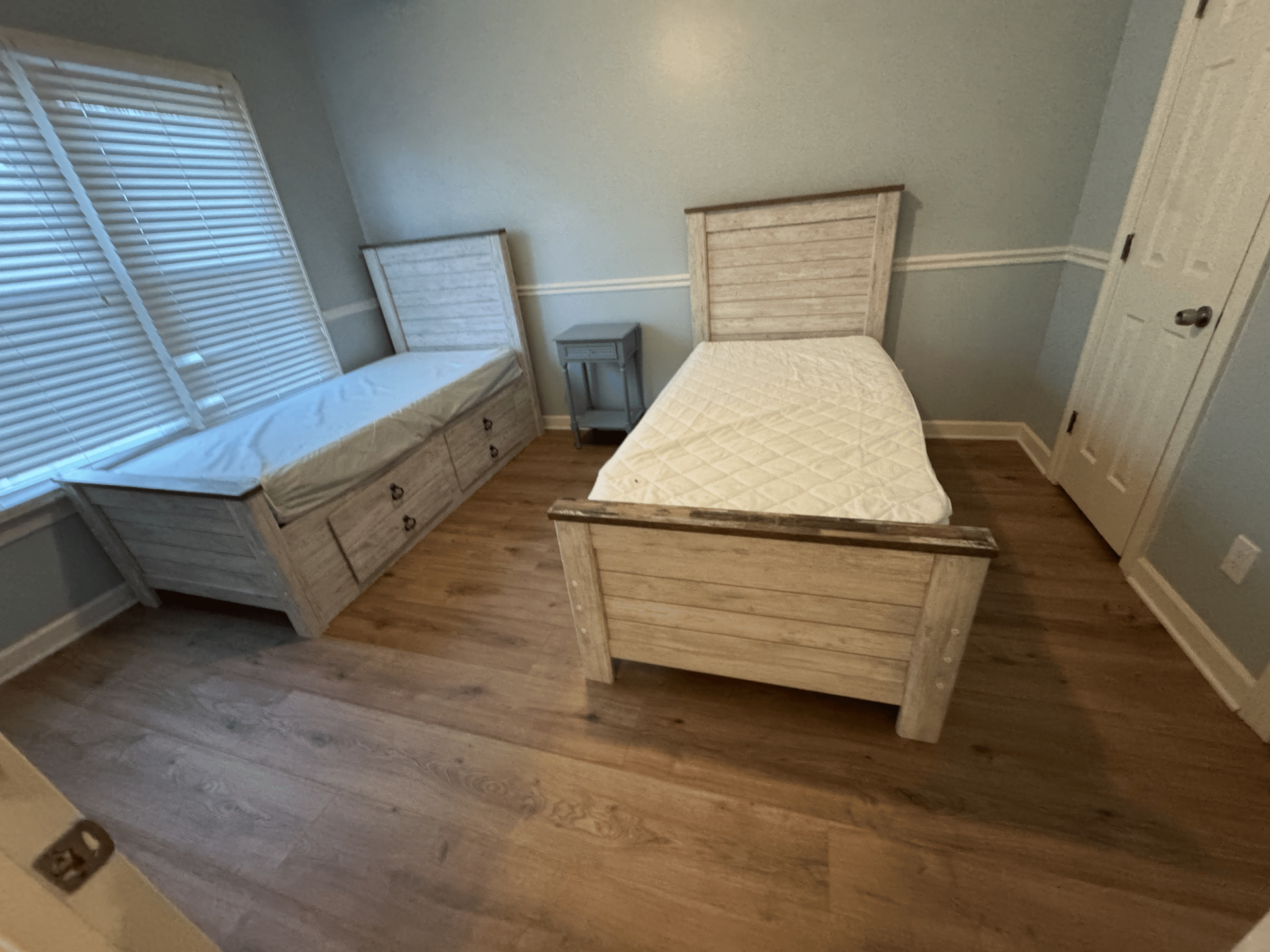 We installed a modern gray oak laminate flooring throughout the bedrooms and closets to create a clean and cohesive look across the home. The wide planks feature a subtle wood grain pattern that adds natural character while maintaining a sleek, contemporary feel. With its durable, waterproof, and scratch-resistant design, this flooring is perfect for everyday living and will hold up beautifully in both high-traffic areas and private spaces. The consistent flow from room to room enhances the sense of openness, while the soft gray tones complement the light walls and trim, creating a bright and inviting atmosphere that is both stylish and practical.