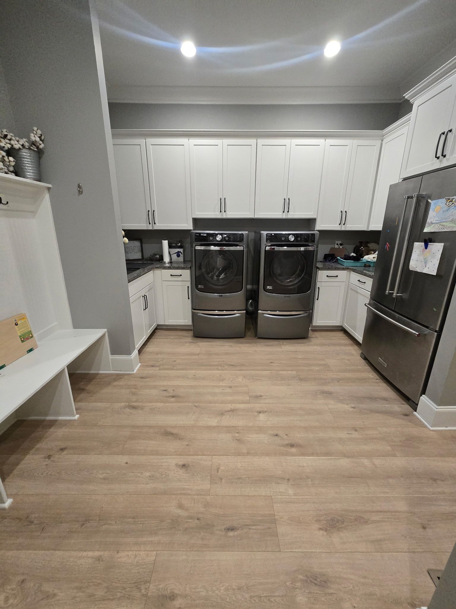 We installed a warm, natural oak laminate throughout the Gabriel home to bring a cohesive and inviting look across each space. The wide plank design adds a touch of modern style while offering the durability and low-maintenance benefits perfect for a busy family home. This waterproof and scratch-resistant flooring is ideal for high-traffic areas, providing the beauty of wood with the resilience of laminate.
