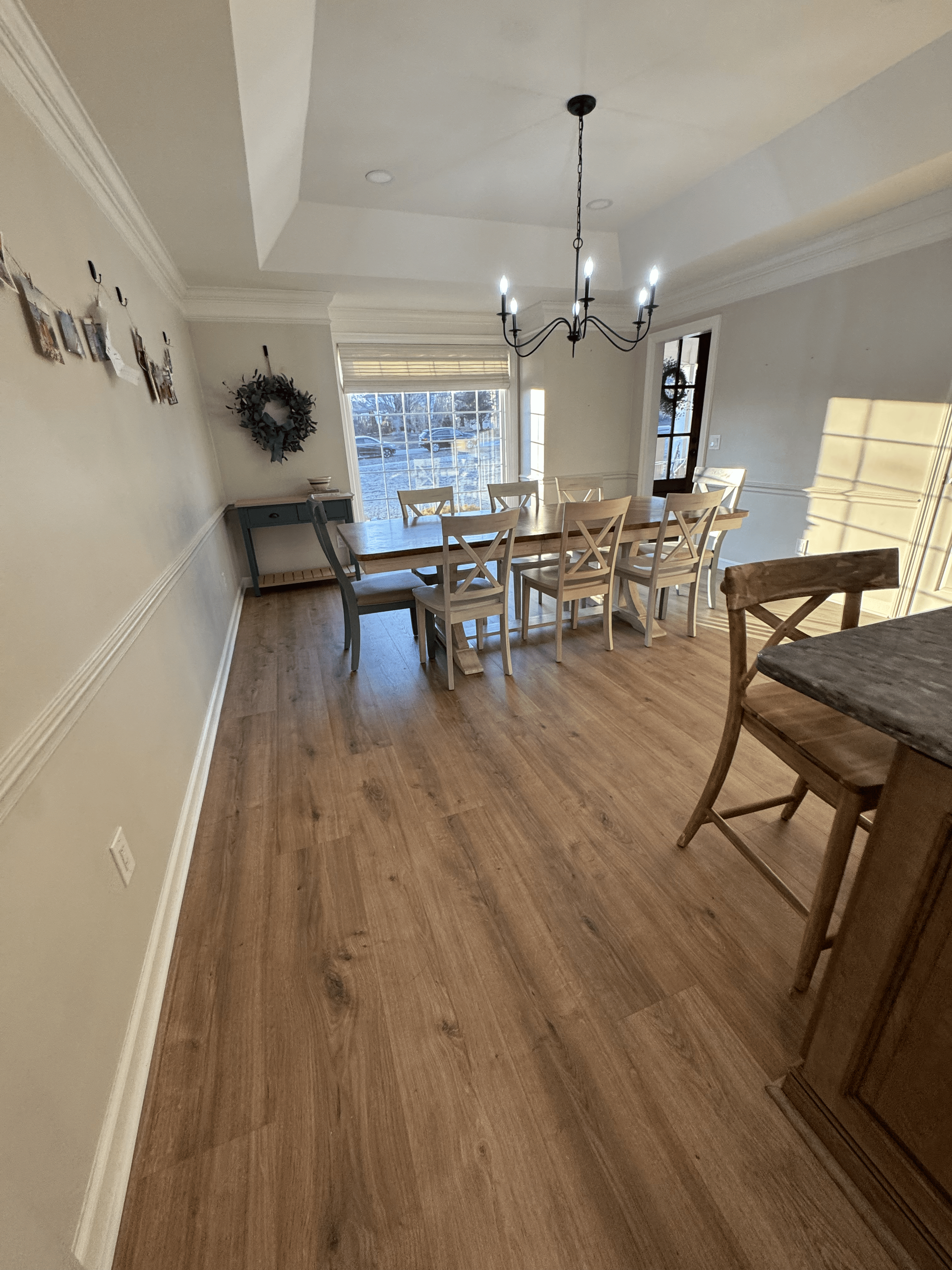 To transform the flow and feel of the home, we installed premium engineered hardwood throughout the main living areas. Each board was placed with precision to ensure clean lines and a smooth, consistent layout from room to room. The wider planks add visual depth while providing a stable, long lasting surface suited for everyday living. The warm finish adds contrast against the light walls and trim, creating a balanced backdrop that ties together the kitchen, dining, and living spaces. The result is a refined, cohesive foundation that elevates the home's character and brings a fresh sense of comfort and style to every area.